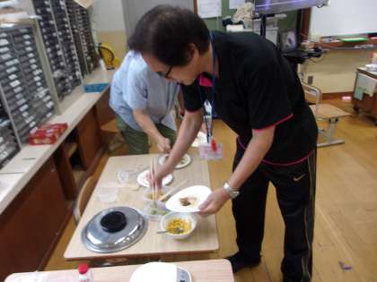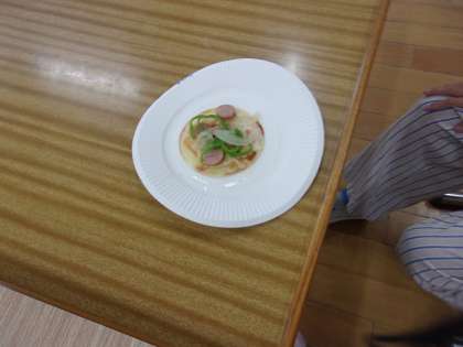 調理実習Part2では、餃子の皮を生地にしたピザをつくりました。自分の選んだ具材をトッピングし、いただきました。