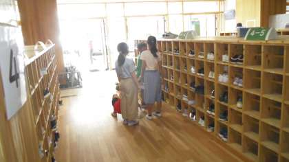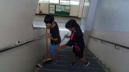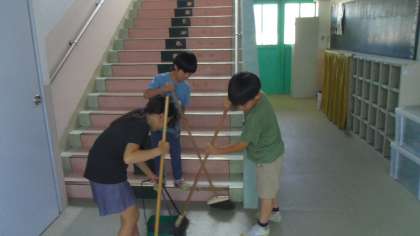 廊下、渡り廊下、階段、玄関ホールなどでも子どもたちはしっかり掃除をしていました。