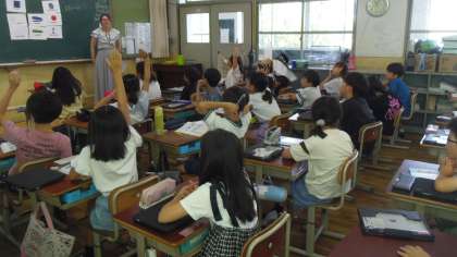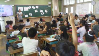 授業の後半にはゲームで文房具に言い方に慣れ親しみました。ALTの先生と一緒に楽しく活動しました。