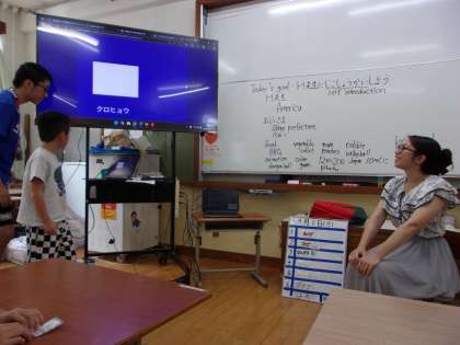 2学期から来られたALTの先生に、事前につくっていたロイロノートのスライドを見せながら「My name is 〜.」、「I like 〜.」と子どもたちは自己紹介をすることができました。