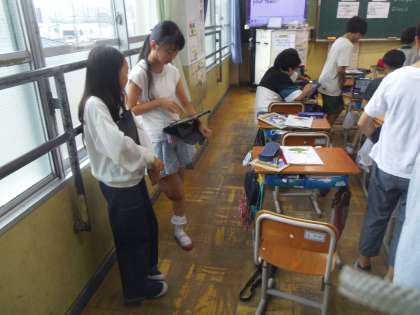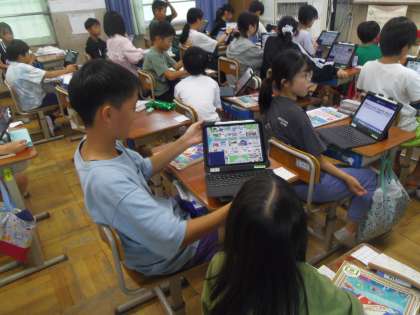 後半にはペアトークをしました。タブレットを使って自分が作ったマイタウンのお気に入りの場所に道案内をしました。
