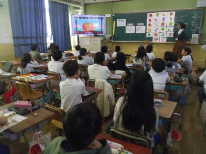 次に歌、チャンツで果物、野菜の言い方に慣れ親しみました。