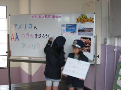 スチューデントシティでは,それぞれのブースだけで商品を紹介するだけではありません。写真の様子は,航空会社の社員の児童が,人の往来の多い場所で紹介している様子です。はじめは少し恥ずかしかったのか,小さい声でしか話をすることができませんでしたが,時間がたつにつれ,大きな声で堂々と商品の紹介をすることができてきました。