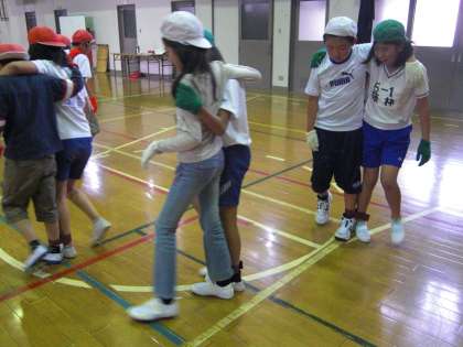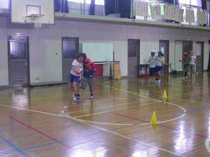 子どもたちは,円の中で2人3脚を行いながら騎馬戦を行います。そのため,自由に円の中を動き回ることが必要です。今回,体育館のバスケットボールのサークルや,カラーコーンを使って,カーブしたり,後ろに下がったりする練習も行いました。当日の子どもたちの動きが楽しみです。