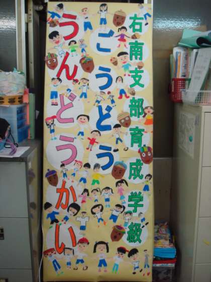 28日(水)に合同運動会があります。2年生の子どもたちも開会式と準備運動に参加します。その日のために立て看板を作りました。子どもたちには仲良く手をつないでいる子どもたちのイラストをかいてもらいました。看板にはってみると,とてもにぎやかで楽しい雰囲気に仕上がりました。当日がますます楽しみです。準備運動のダンスもとてもかわいくて,みんなのお気に入りになりました。
