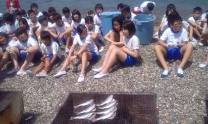 昼食は,地引網で取った魚を焼いて食べます!