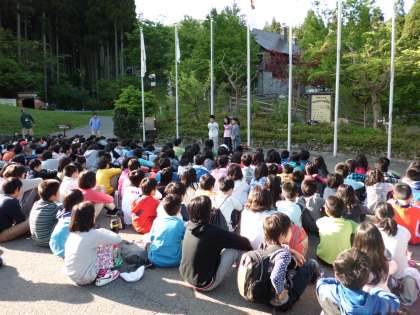 昨日から,御室小学校と桃山東小学校と一緒です。合同の朝の集いの様子です。