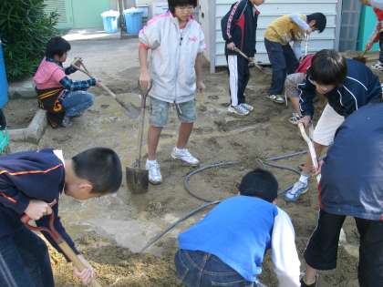流れる水のはたらきの実験を砂場でしました。砂場で川を作り流す水の量を調節したりダムを造ったり・・・。どんぐりころころ♪と聞こえてきたり。楽しいひとときでした。