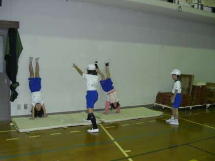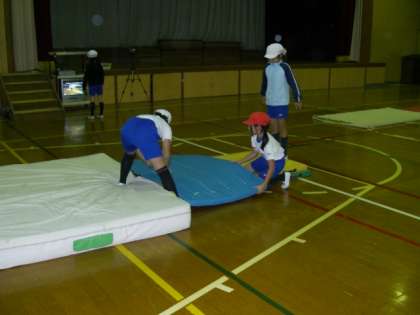 「マットあそび」のねらい2の場では,自分のめあてにあった場を自分たちで作り,練習しています。場を選ぶだけなく,練習しやすいように場を作りかえるなど,自ら考え,工夫しながら取り組んでいます。