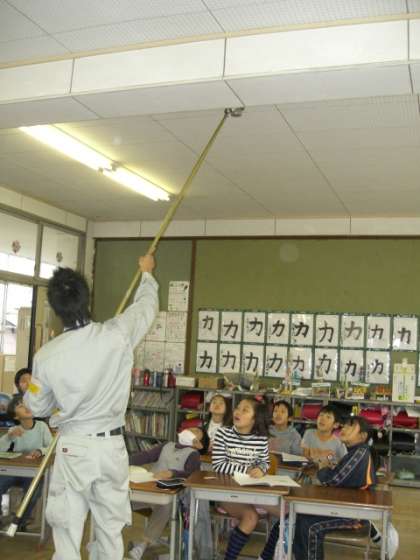 今日は,教室に消火設備の点検に来ていただきました。見慣れぬ道具を使っててきぱきと仕事を進められる姿を子どもたちが不思議そうに見ている間に,作業は終わりました。これで,安心して授業に集中できますね。ありがとうございました。