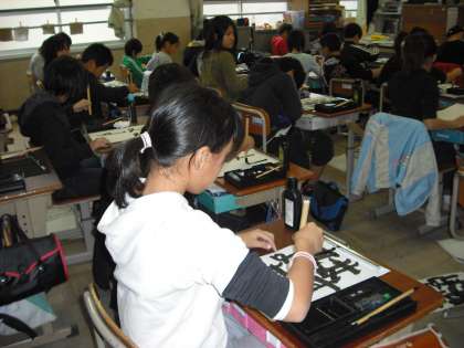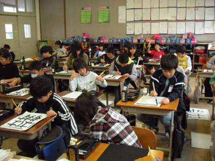 4年生では、書写の毛筆で『はす』を書きました。これまで、毛筆では漢字ばかり書いてきましたが、今回はひらがな。「結び」の筆づかいは、これまで書いた漢字にはない曲線的な筆の動きなので、慣れない子どもたちにとっては少し難しかったようです。それでも、「うまく書きたい!」という気持ちで、一人ひとりがめあてをもってがんばって書きました。なかなかの力作が出来上がっています。