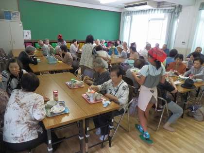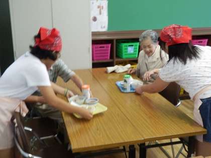 9月14日(土),「敬老の日のふれあい喫茶」が行われました。(先日,右京区社会福祉協議会より表彰していただいた取組です)70歳以上の方をお招きして,昼食を食べていただきました。この日のメニューは,炊き立てのお赤飯と揚げたての野菜のてんぷら,そしてお菓子でした。