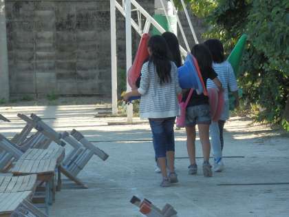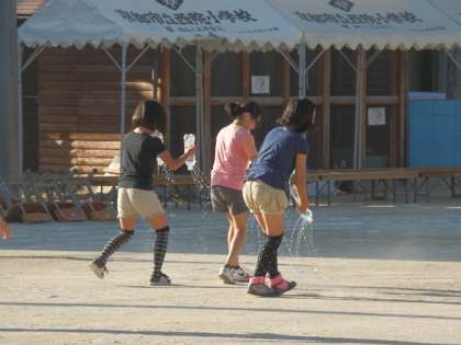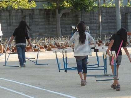 準備係が競技で使ういろいろな道具を運んだり,整備係が運動場の砂埃を抑えるために水をまいたりする仕事をしていました。これらの仕事は,明日もします。