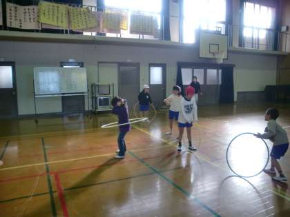 フラフープ(輪)・・・輪を使ってなわとびのように跳ぶ、転がす、輪を体を使って回す