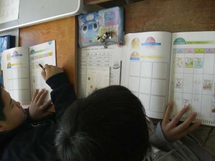 今日は英語授業がありました。教科を英語で表したり曜日を覚えて予定表を完成させました。