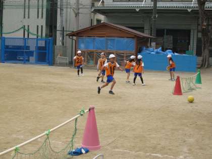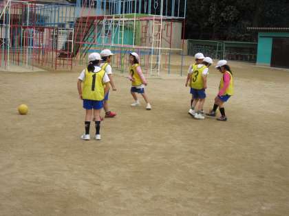 「ボールけりゲーム」の試合を始める前にまずはチーム練習です。声をかけあったり,作戦を考えたり,パスをつなげたりと工夫して練習しています。一試合一試合に全力で臨んで,全力で応援しています。
