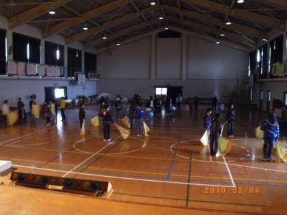 6年2組のフラッグの練習も進んでいます。フラッグの動きをそろえることは勿論,バラバラの服装でも統一感を持たせる工夫なども取り入れられました。