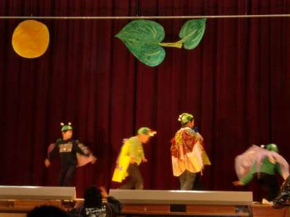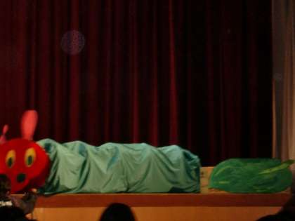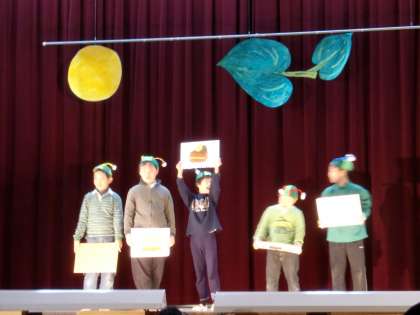 今年の学芸会は, 劇「はらぺこあおむし」をしました。たまごからポンと産まれたあおむしたちが, 自分たちの好きなものをいっぱい食べていきます。ガリガリくん, ホットケーキ, えびしゅうまい, ウインナー, 白たいやきなど, 食べるものを言うたびに, 会場から「えーっ!」とか「わあー」とか反応があって盛り上がりました。食べ過ぎたあおむしたちは, おなかがいたくなって, 草を食べてどんどん大きくなりました。そして, ちょうちょになって喜びの歌を歌いました。会場のみんなが手拍子をしてくれました。ありがとう! 楽しかったよ!!