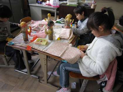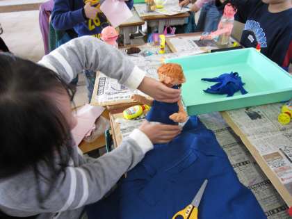 肌の色がぬり終わったら,今度は衣装作りです。持ってきた布などをはり付けていきました。どうしたら,思っているような衣装になるのか,じっくり考えて作ろうと頑張っていました。