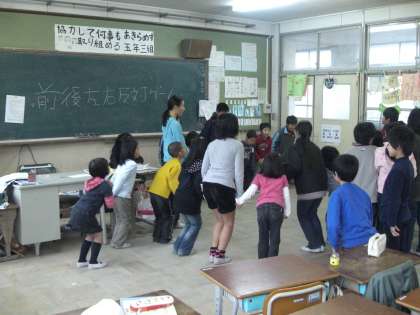 今日はふれあい遊びがありました。今年度最後のふれあい遊びです。今日の遊びは「前後左右反対ゲーム」でした。リーダーの命令の言葉の反対の動作をします。意外と難しく反応がワンテンポおくれていました。