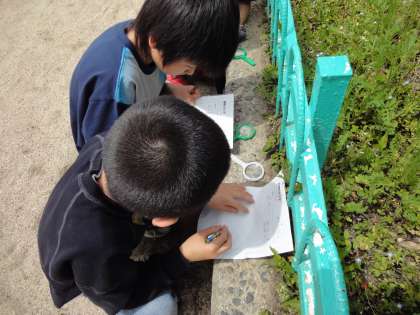 理科の授業で,動物,植物の観察をします。「葉は○センチくらいで表がでこぼこしているぞ。」「桜の葉は上の方がしげっている。」「金魚はいつも背びれがゆらゆら動いているぞ。」など普段から目にしているけど,視点を変えて見ると新しい発見が続々でてきました。