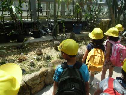 5月27日(水)京都府立植物園へ遠足に行ってきました。入学して初めての遠足で,1年生の子どもたちは「ドキドキ」「わくわく」いっぱいでした。ここのところ暑い日が続いていましたが,図鑑を持って植物や生き物を見たり,芝生で遊んだり,元気いっぱいに活動していました。