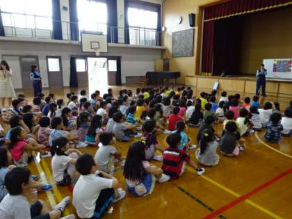 右京警察署交通課の警察官の方々や交通安全推進委員の方々にお世話になり,道路の安全な歩き方について学びました。横断する時も,道路に出る時も左右の安全をしっかりと確認することの大切さを知りました。下校時などで,実際に安全を確かめながら歩けるようになってほしいです。