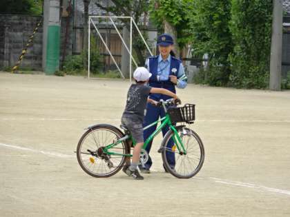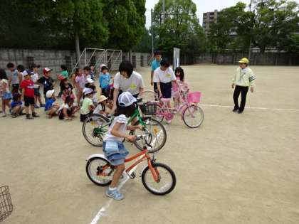 2年生は,自転車の乗り方について学びました。自転車は車の仲間であること,自転車が走ってよいところといけないところが決められていること,道路標識に従って乗ることなど交通ルールについて教わりました。その後,実際に自転車に乗って安全な走行の仕方を学びました。だんだん自転車に乗る機会が増えてきています。事故にあわないためにも,学んだことを生かして,安全な乗り方ができるようになってほしいです。