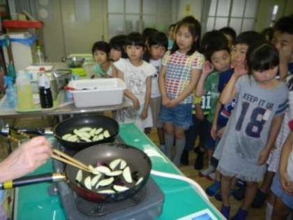今回のテーマは,「野菜発見隊になろう」です。苦手な子が多い「なす」のおいしさを発見するために,なすを観察したり,水につけたり,油でいためたなすのいためものを試食したりして,なす本来の味を楽しみました。