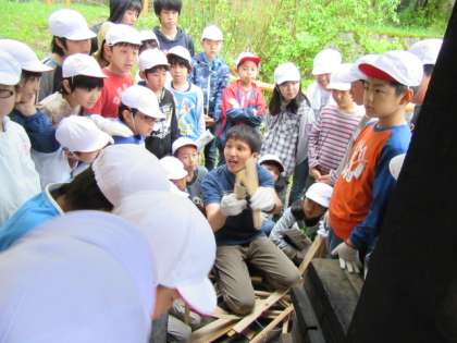 火の係は,まず先生からまきの組み方を教えてもらい,それぞれのかまどで火をつけていきます。
