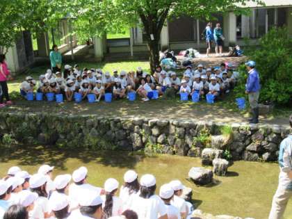 初めに,イワナのつかみ方について教えていただき,1クラスずつ順に川に入って,イワナつかみに挑戦です。