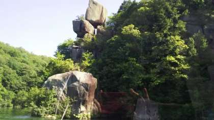岩の上に岩が乗っていて,まるで品という字に見えるので,「品の字岩」と名付けられました。