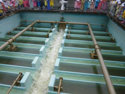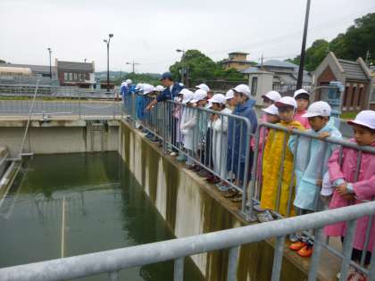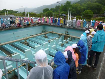 行ってみないとわからない「水のにおい」や「色」を感じ,歓声をあげていました。急速濾過池の砂にたまっているゴミを取り除く作業も見せていただきました。