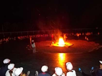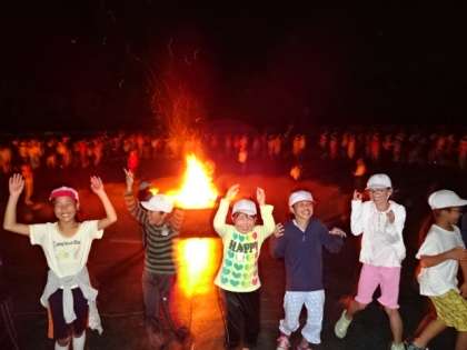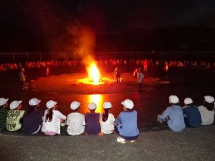 キャンプファイヤーでは、レク係を中心に、楽しいゲームやスタンツが用意され、4年生の子どもたちの心が一つになり、楽しんでいました。