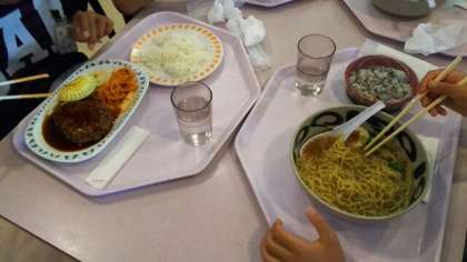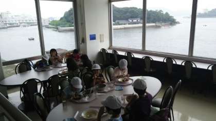 昼食は,鳥羽水族館の中のレストランで食べます。カツカレー,伊勢うどんセット,ラーメンセット,ハンバーグセットの中から食べたいものを選んで,自分で注文して食べます。