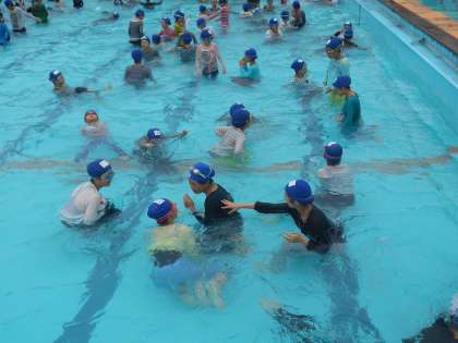 着衣泳が始まると,いつもの水泳とは違う感覚に子どもたちは驚いているようでした。