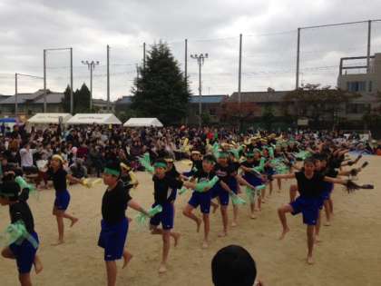 西院小学校の4年生有志が,特設ステージで,団体演技「ミルクムナリ」を披露しました。グラウンドにペットボトルで奏でる音を響かせ,息の合った動きで踊ることができました。大きな歓声と拍手が会場に響き.おまつりを盛り上げることができました。