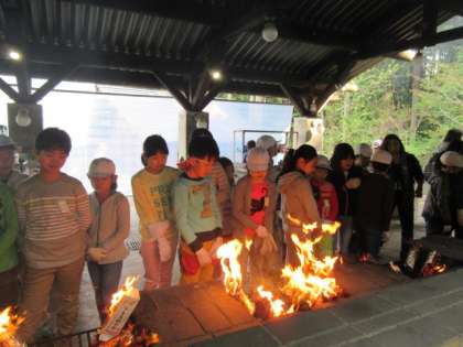 アルミホイルに包んだパンが入っている牛乳パックを逆さまにして、かまどで火をつけます。牛乳パックが燃え切ったら、出来上がりです。