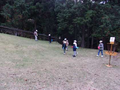「フライングディスクゴルフ」はフリスビーでゴルフのように何回投げてリングに入れたれるか。「スコアオリエンテーリング」は、山の家らしく、山を散策しながら自然に関するクイズをグループで解いていきます。楽しい声が聞こえてきました。