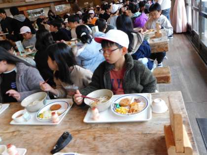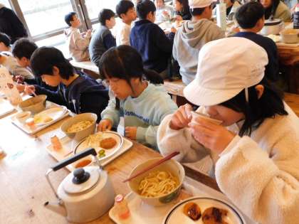 メニューはきつねうどんとバイキングでした。今日は少し寒い日だったので、あたたかいおうどんがとても体にしみわたりました。お昼ごはんを食べてまた元気になり、昼からの活動も頑張っていきます。