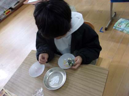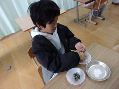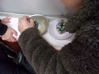 矢車学級では、図画工作科の学習で「クリスマスツリーをつくろう」の学習を行いました。ツリーに見立てた松ぼっくりにボンドを塗り、ビーズなどの飾り付けをしました。子どもたちは集中して取り組んでいました。