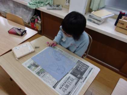 矢車学級では、図画工作科の学習で木版画に取り組んでいます。彫刻刀を安全に気を付けて使い、彫り進めています。