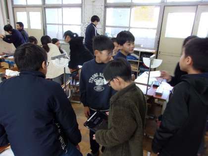 グループで役割分担をしながら、ふりこが1往復する平均の時間を求めていました。