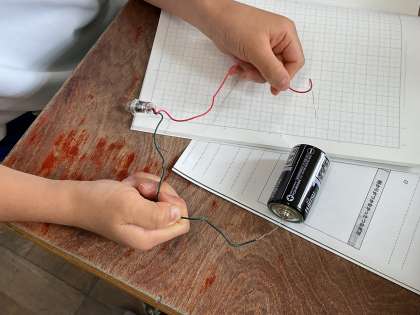 理科の学習で、豆電球に明かりをつける実験をしました。どう線と乾電池のつなぎ方や乾電池の向きに着目して、実験を行いました。