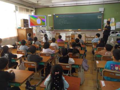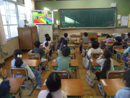 Unit1の3回目の授業を行いました。今日は普段4,5,6年生の外国語科を教えている英語専科教員と一緒に学習しました。はじめに色の動画を視聴して色の言い方を思い出しました。