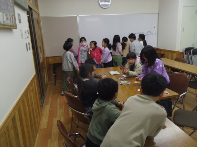 昼休みにイングリッシュカフェを開きました。3年生の子どもたちがALTの先生とカードゲームを楽しんだり、おしゃべりを楽しんだりしました。