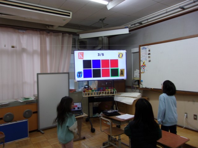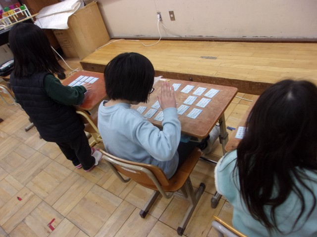 あるチームでは、五色百人一首(青)をしたあと、口の体操を兼ねてリズムに合わせながら声を出しています。そのあと今回は個別に漢字の学習をしました。