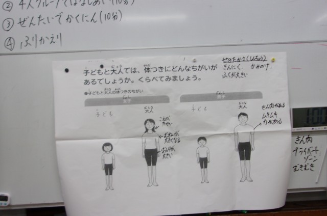 今回のめあては「せいちょうするからだについてしろう」でした。「子どもと大人では体つきにどんなちがいがあるのだろうか」ということをみんなで考えました。