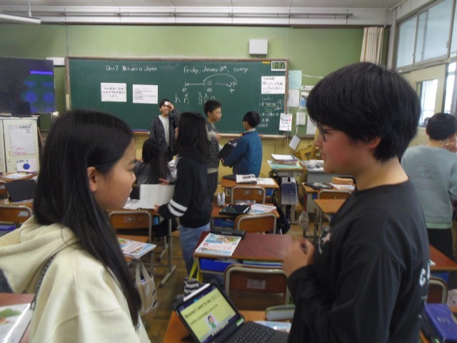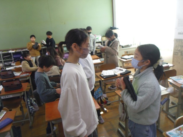 その次にペアトークで日本で行きたい所とそこでしたいことを伝え合いました。今までの学習を生かして多くの子どもたちがメモをみないでしっかり伝え合っていました。
