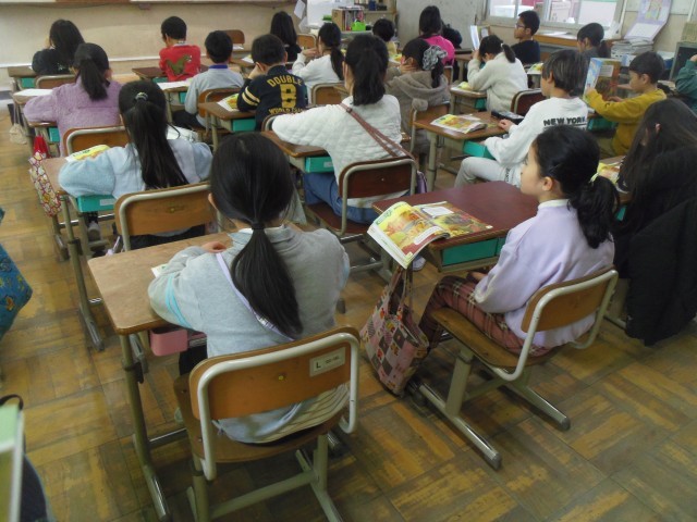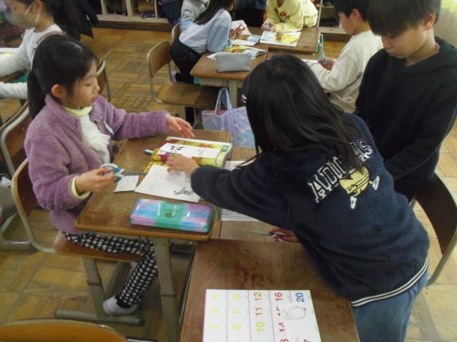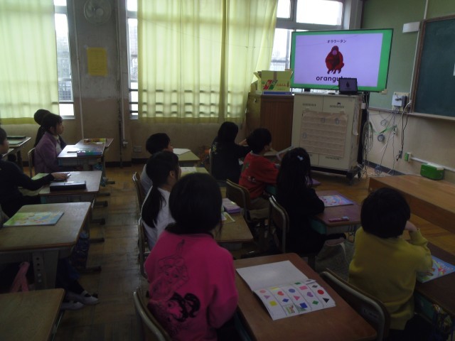 はじめに歌を歌いました。日本語と英語のリズムや音の違いに注意しました。次に教科書の絵本の読み聞かせを聞きました。最後にUnitの最後の活動で行う動物をグループきめました。